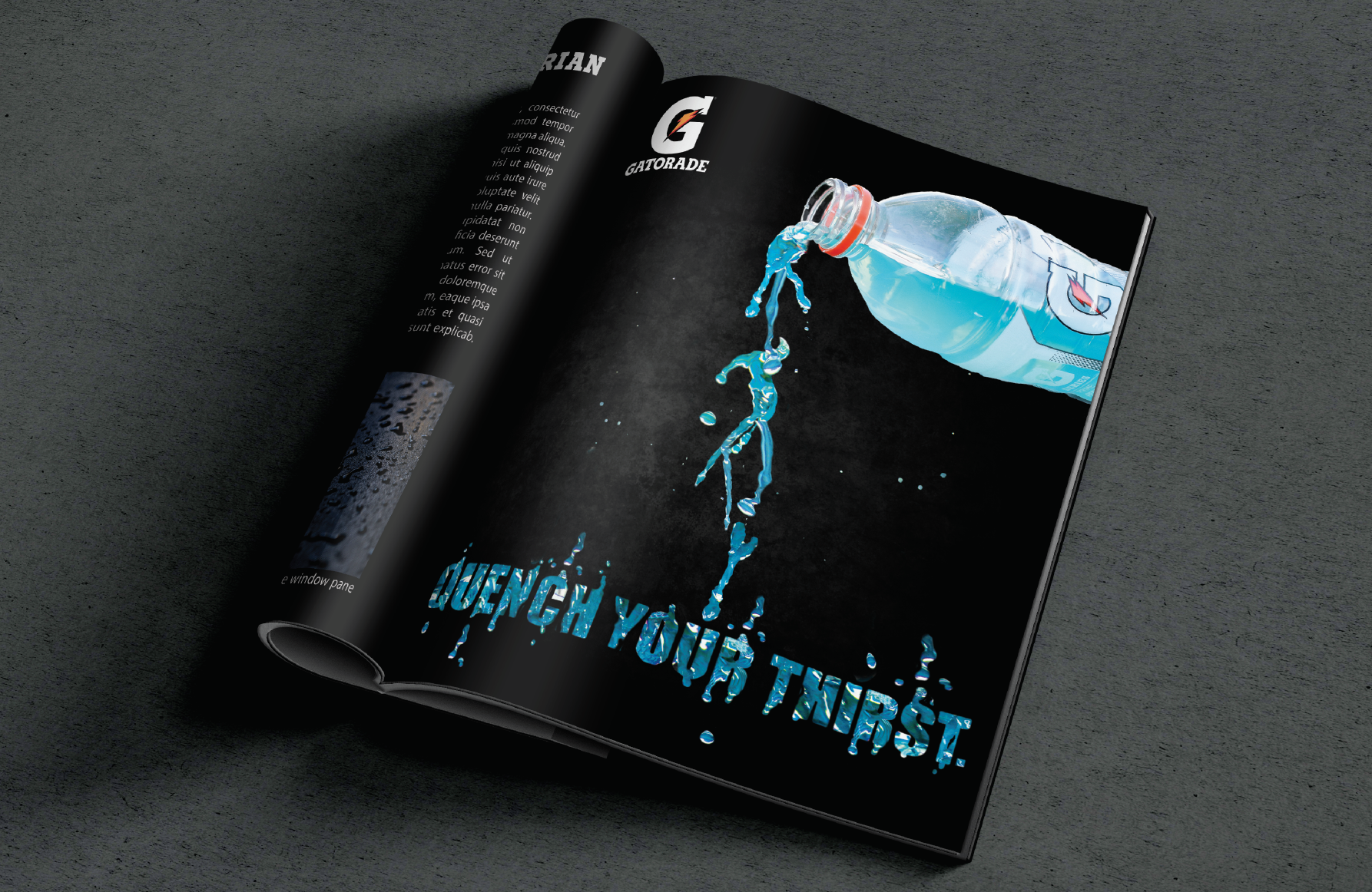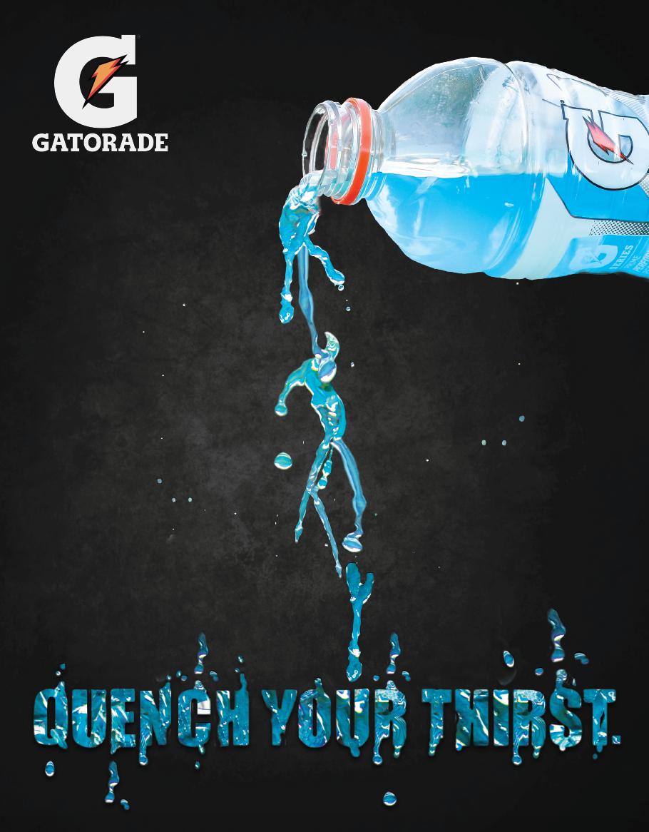 Advertisement for Gatorade I took high shutter speed photos of the liquid being poured, then composited it into this creation, as well as created text with the liquid.